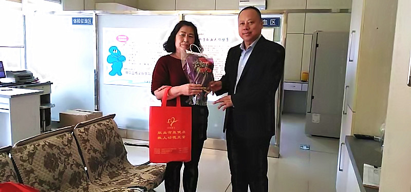 松原市中心血站党支部书记 站长 许井彦(右)为献血者献花