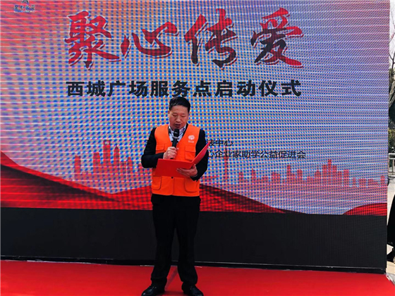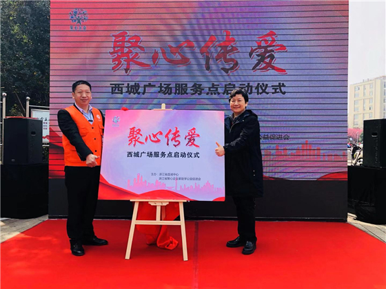 活动现场,浙江省聚心公益执行董事长何卫东和浙江省血液中心副主任徐健共同为“聚心传爱”——西城广场献血服务点揭牌。