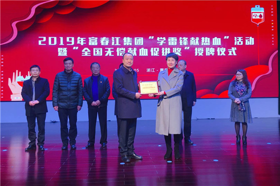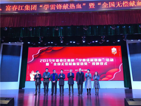 3月5日上午,在富阳区富春江集团举行2019年度富春江集团“学雷锋献热血”活动暨“全国无偿献血促进奖单位奖”授牌仪式。杭州市卫生健康委员会党委委员副主任朱燕锋、浙江省血液中心主任胡伟、杭州市献血管理中心主任洪丽冰、富阳区卫生健康局党委委员副局长赵华春等领导出席本次活动,来自富春江集团的300余名爱心员工们参加了本次活动。