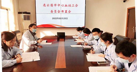 2022年2月25日上午,连云港市中心血站工会委员会2022年工作部署会在行政楼三楼会议室召开,会议总结了2021年度工会工作,对工会2022年度工作计划进行了研究和部署。血站党总支委员、副站长、工会主席穆培栋,副主席田芸和全体工会委员出席本次会议。