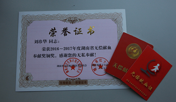 当天上午9点,工作人员首先来到紫宸澜山,为该小区及周边预约献血的居民服务。第一位预约献血者名叫刘珍华,是紫宸澜山小区的住户,当天已经是刘女士第六次献血了。据了解,刘女士因无偿献血总量达到2000毫升,荣获了“湖南省无偿献血奉献奖铜奖”,工作人员还给她带来了荣誉证书,现场授予。