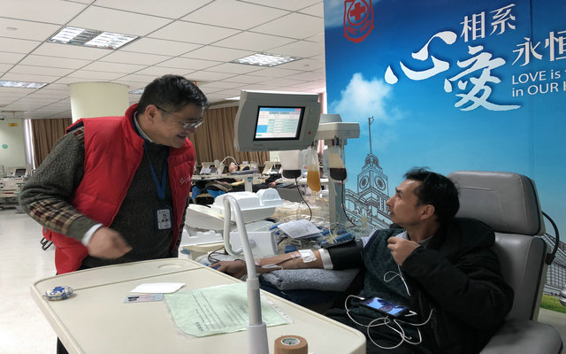 3月1日,上海市血液中心副主任朱自严身穿红色志愿者马甲来到中心3楼单采室参与关爱成分献血者志愿服务。