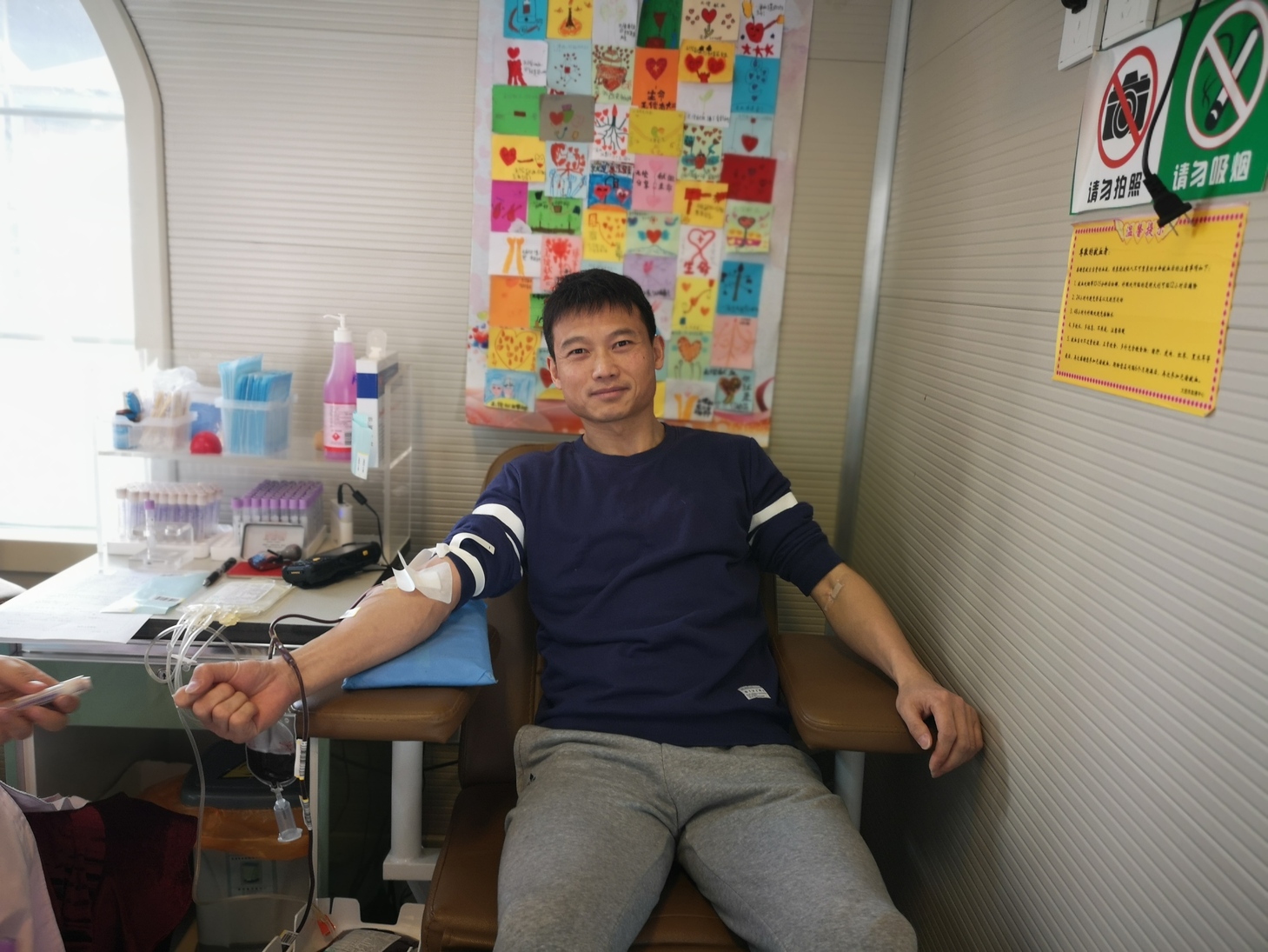 李小平的儿子小李陪他一起献血,小李说:“看见爸爸献血,我非常自豪,我长大了也要向爸爸一样,献血救人,奉献爱心。”