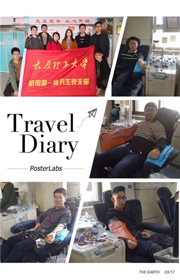 2019年3月18日,太原理工大学机电第一研究生党支部组织师生开展无偿献血活动,在太原市红十字血液中心二楼机采室捐献机采血小板,用可再生的血小板拯救不可重来的生命,他们希望以自身的行动能感染更多的人加入到奉献爱心、挽救生命的队伍中来,让这个世界更多一点爱。