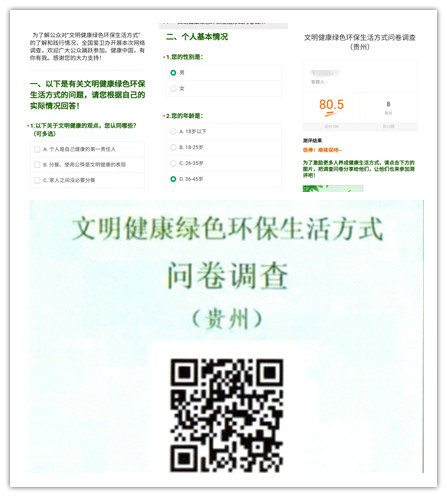 活动中,中心全体党员干部职工通过扫描“文明健康 绿色环保”问卷调查(贵州)二维码踊跃参与,调查分为“文明健康绿色环保生活方式问题”和“个人基本情况”两部分共20个问题,通过问卷调查进一步了解职工对“文明健康绿色环保生活方式”的认识和践行情况,以此检验自身健康知识水平,引导干部职工增强健康理念意识、养成良好健康生活习惯,同时,自觉主动争做文明生活的倡导者、时代新风的传播者、美好环境的捍卫者。
