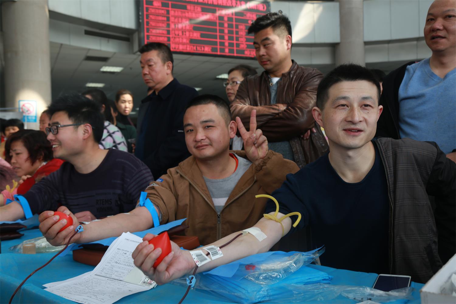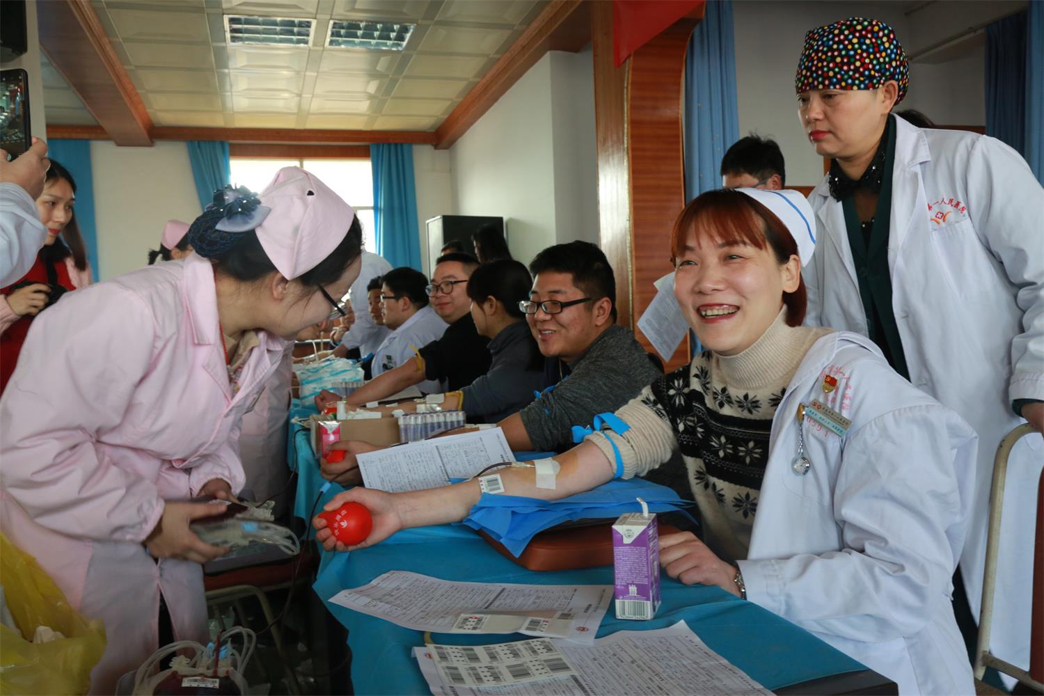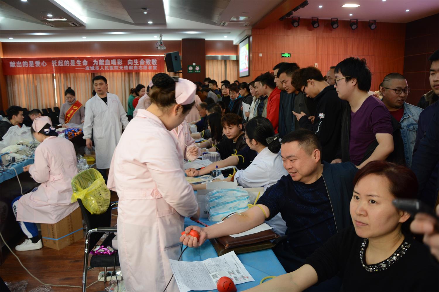 图为孝感市第一人民医院医务人员踊跃献血的场面
