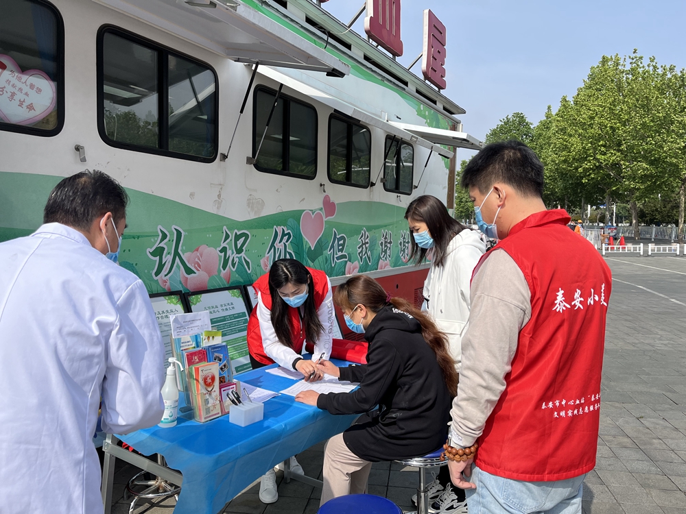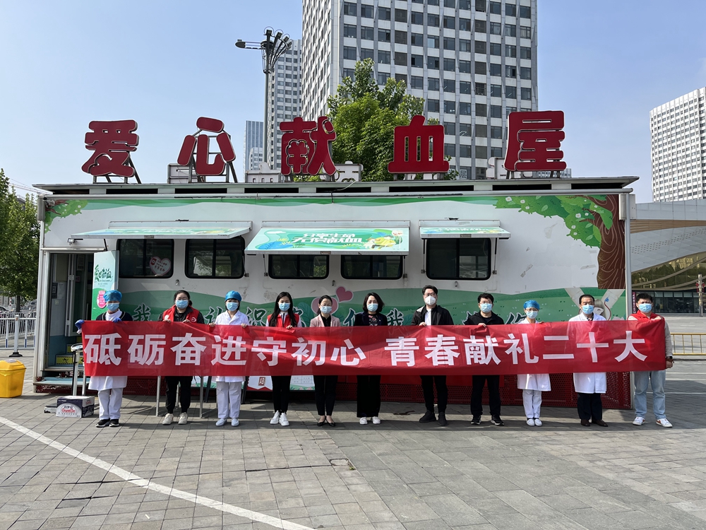 为进一步强化团员青年的思想政治教育, 团结动员血站团员青年坚定理想信念,充分发挥团员青年的生力军和突击队作用,5月4日,泰安市中心血站团支部在万达广场开展了“砥砺奋进守初心 青春献礼二十大” 主题实践活动。当天上午,市中心血站团支部有关负责人以及青年志愿者们走上街头宣讲无偿献血知识常识,在爱心献血屋为献血者提供全程暖心服务,并发放了文明创建和献血知识宣传折页。万达广场的许多市民自发的来到“砥砺奋进守初心 青春献礼二十大”的条幅前面签名留影。