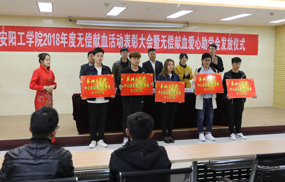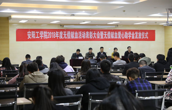 为鼓励在校大学生积极参与社会公益事业,2019年3月20日, 2018年度无偿献血活动表彰大会暨无偿献血爱心助学金发放仪式在安阳工学院顺利举行。