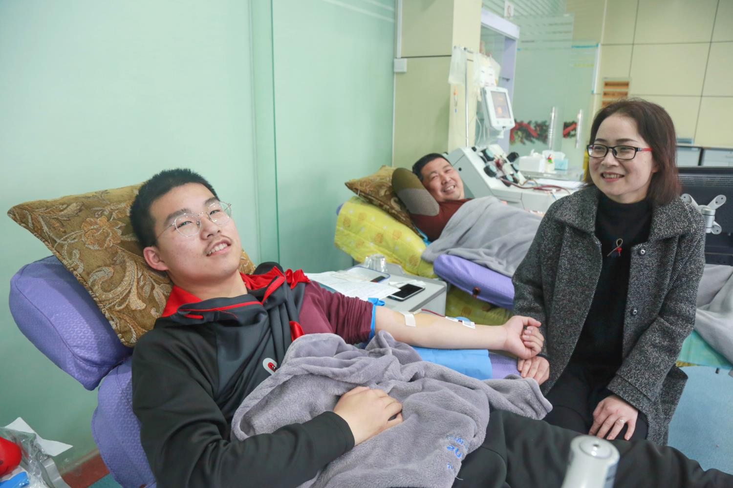 3月21日中午,在孝感市中心血站献血大厅,一位在当日刚满18周岁的少年,以和父亲一起献血的方式,庆祝自己成年。