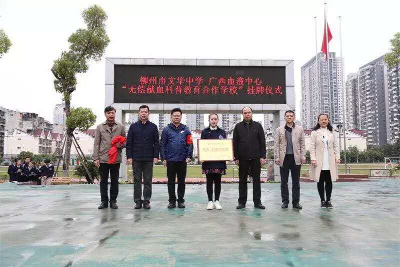 3月25日上午,广西血液中心无偿献血科普教育合作学校正式在柳州市文华中学挂牌成立,这是广西首个挂牌开展无偿献血知识科普教育和无偿献血公益理念传播的中学。广西血液中心主任刘存旭,柳州市城中区卫健局、教育局和学校领导参加了揭牌仪式。